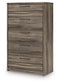 Casually cool style and lots of storage go hand in hand with this chest of drawers. A weathered brown finish over replicated oak grain creates an easygoing vibe, setting the scene in your restful retreat. Clean lines and modern handles provide a fuss-free look. And the chest's five roomy drawers give you plenty of space for stowing away clothes and more.