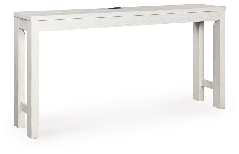 This counter height dining table and barstools set brings an air of casual charm to mealtime. With its antiqued white finish and light gray upholstered seats with nailhead trim, modern farmhouse-style dining has never been so fashionable. Plus the table includes handy USB charging and a power supply. All that’s missing is you and your family.